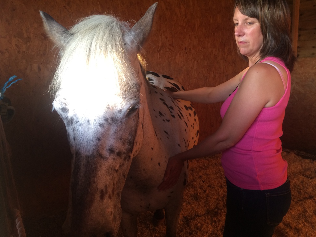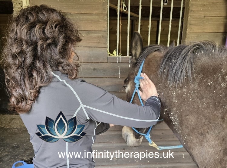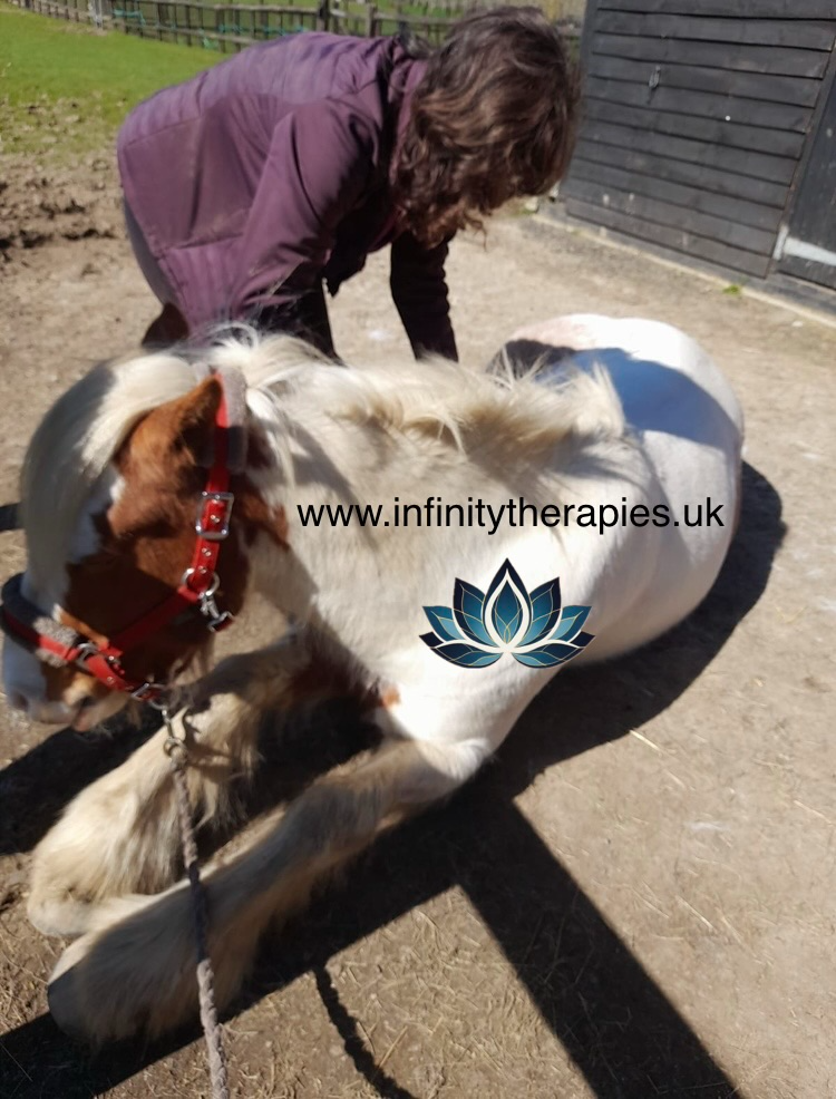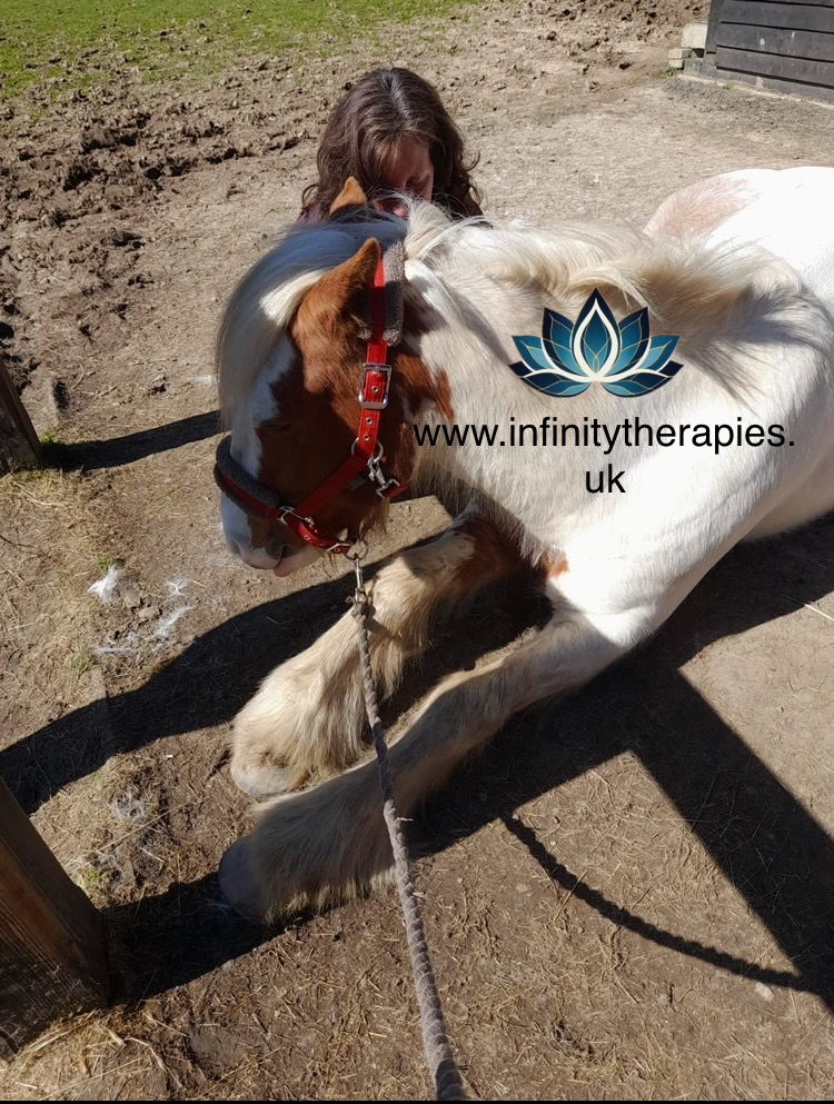 It is a gentle healing therapy that allows for the horse to work though clearing any issues that he/she may have and release them. Horses respond with a release showing signs of relaxation, closed eyes, licking, chewing, yawning, rolling etc.